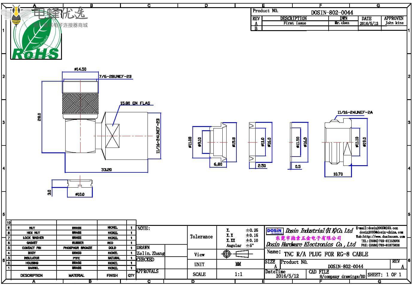 - 同轴线缆,弯式,母头,tnc连接器,螺母锁紧,RG8;