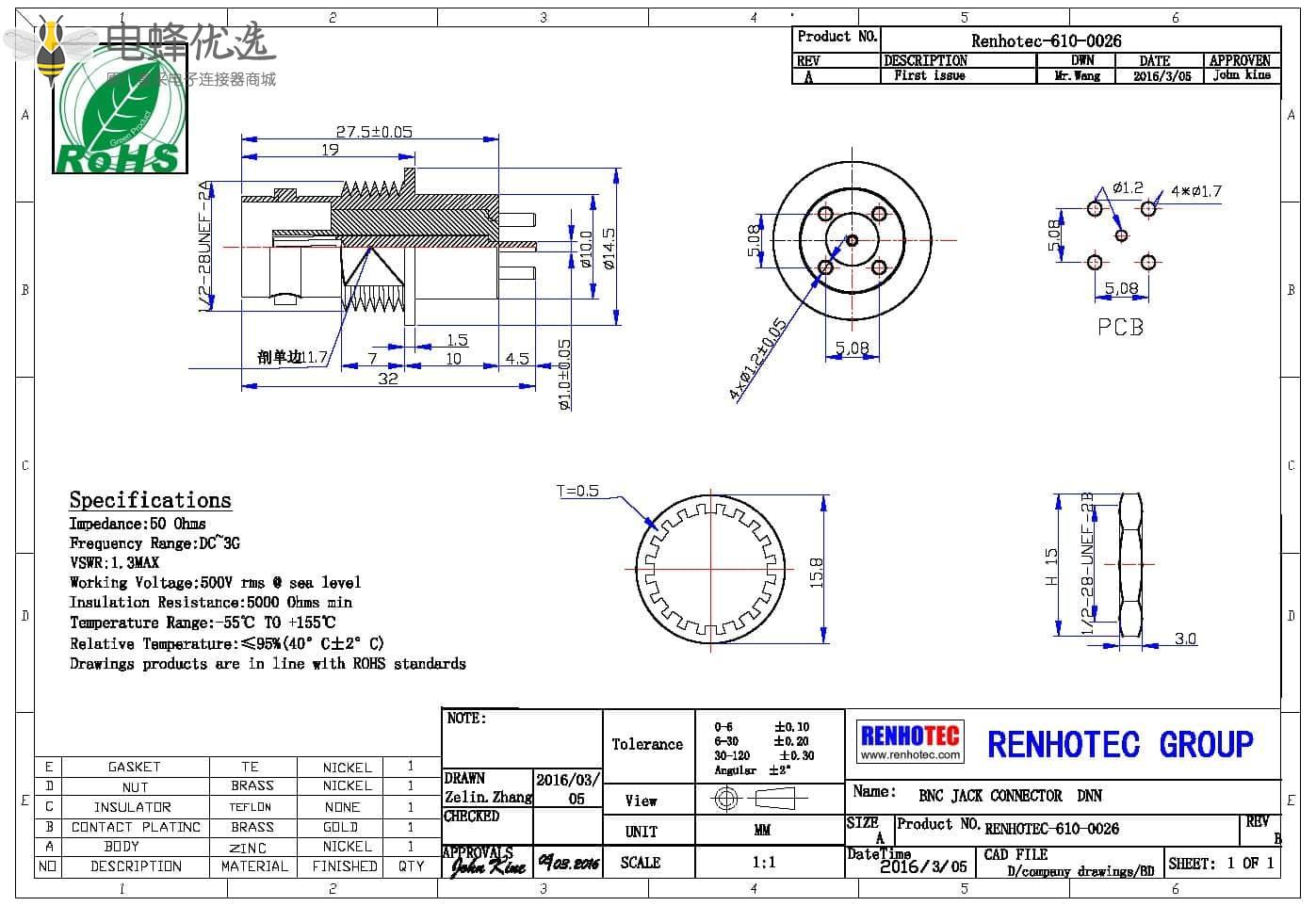 - PCB板端,母头,直式,锌合金,RF射频同轴,BNC连接器,4脚,50欧姆,穿墙;