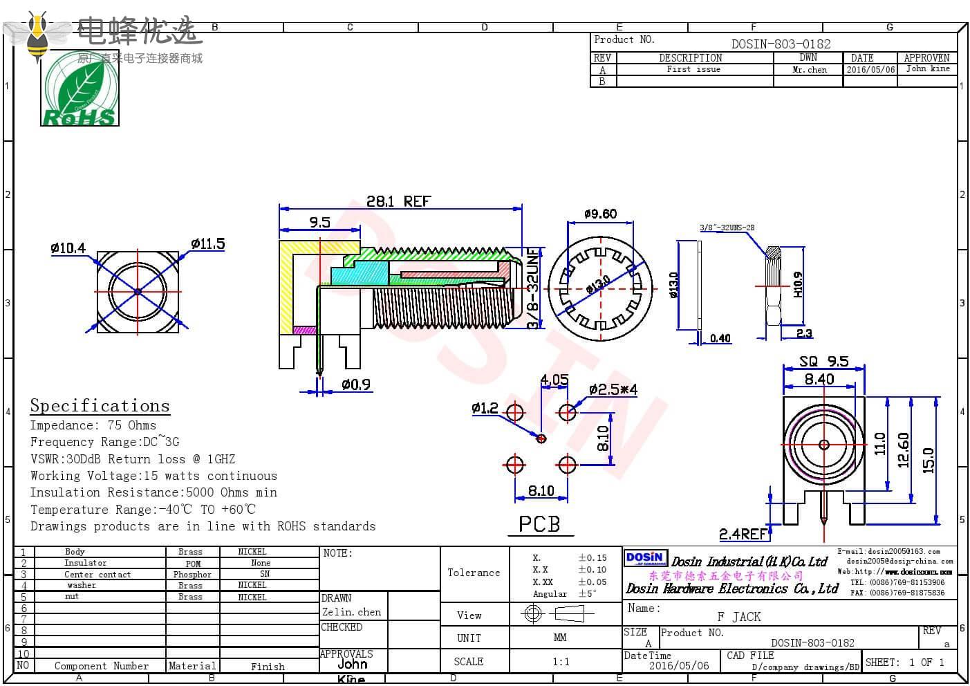 - 中心接触电阻: ≦ 10 mΩ (Milliohms max.)