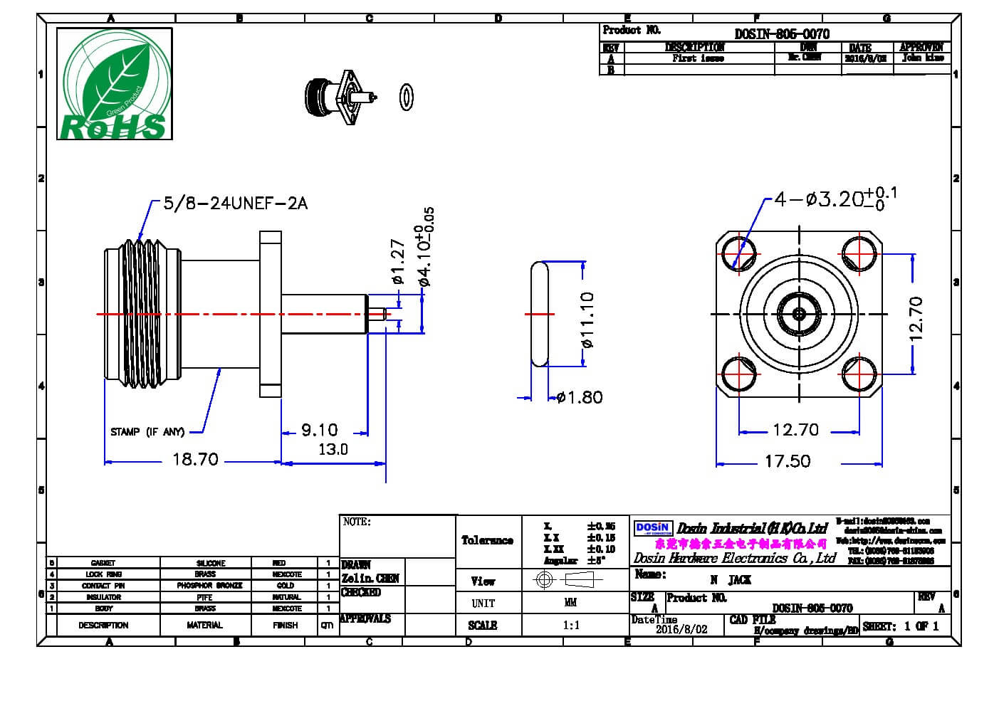 - 中心接触电阻: ≦ 1.0 mΩ (Milliohms max.)