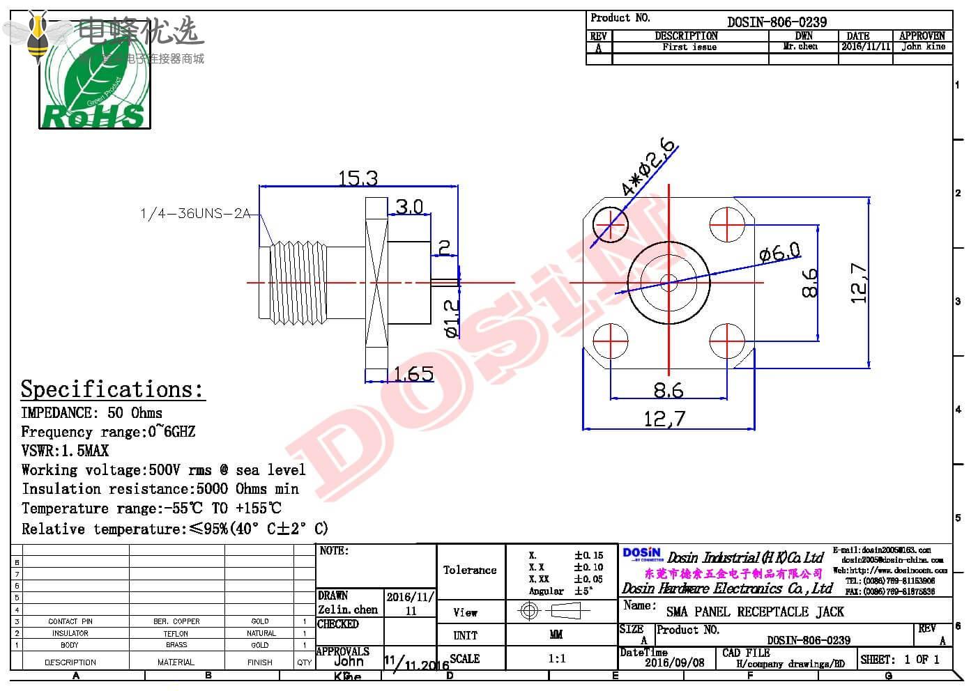 - sma连接器,直式,母头,50Ω,面板,4孔法兰,延长铁氟龙;