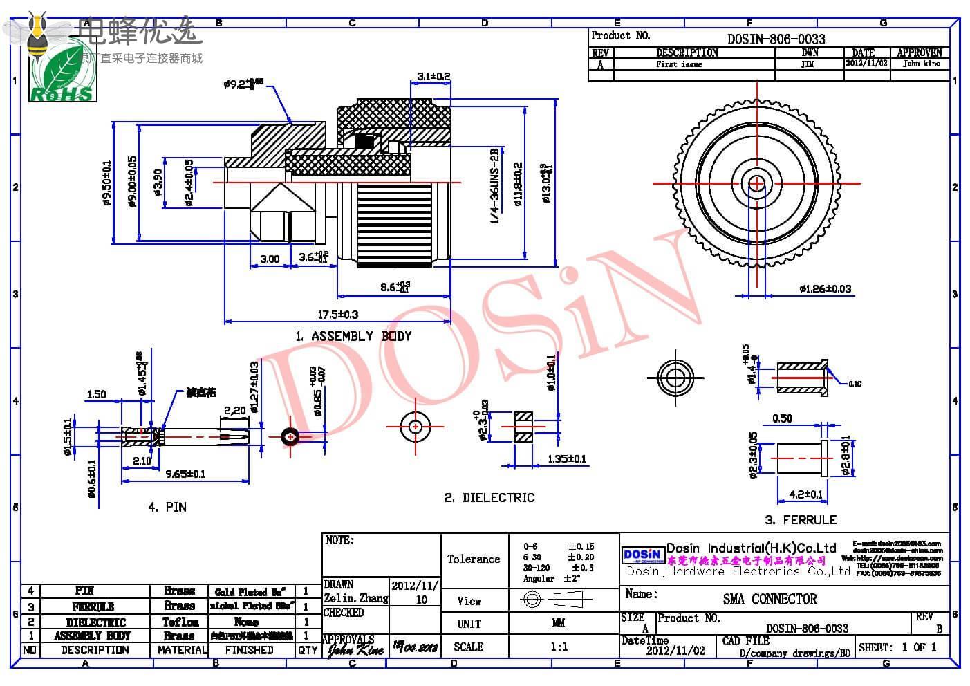 - 高性能电子连接器,频率高达18GHz,低反射;
