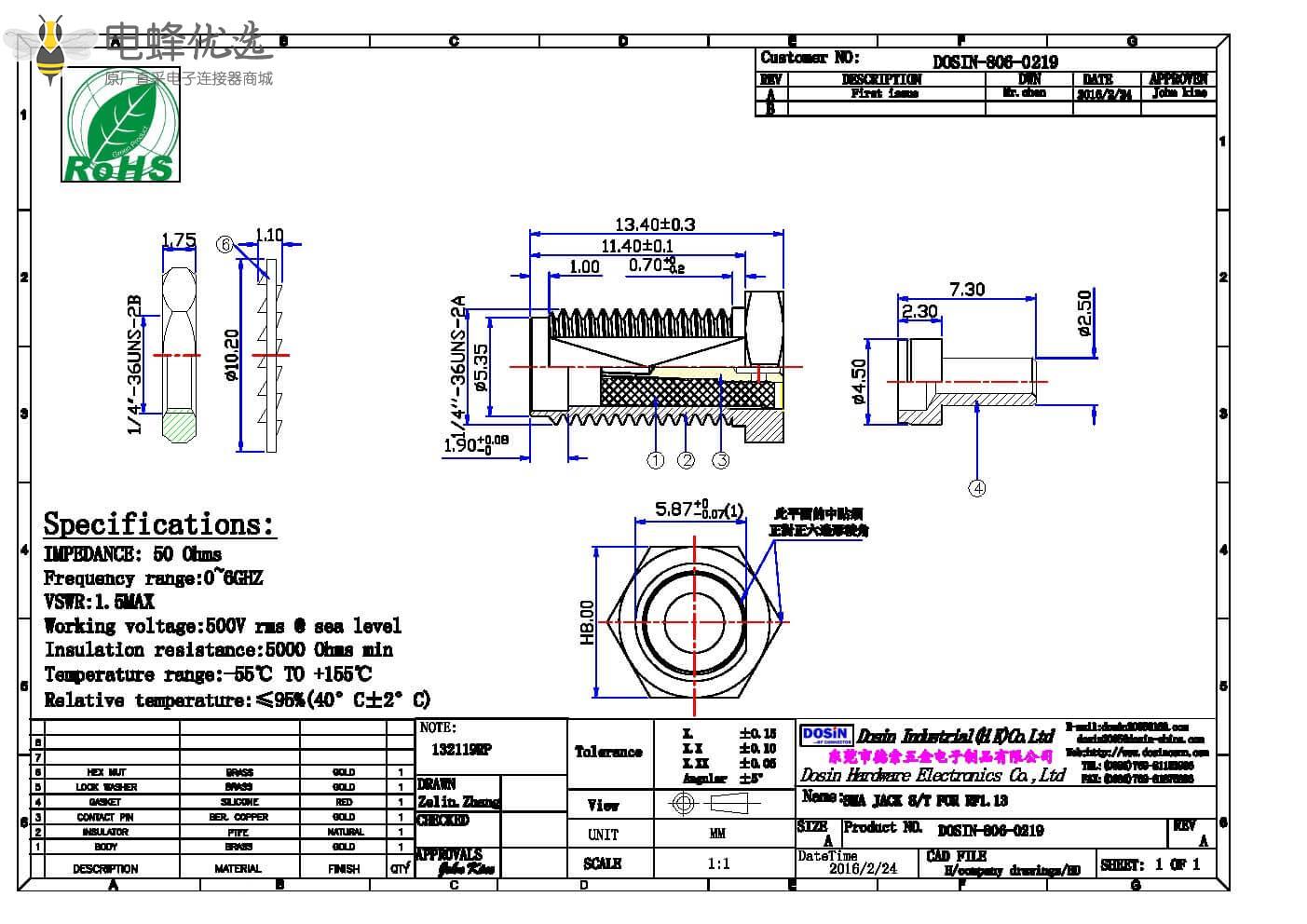 - sma连接器, 同轴线缆, 直式,50Ω, 母头, RF1.13,镀金,焊接;