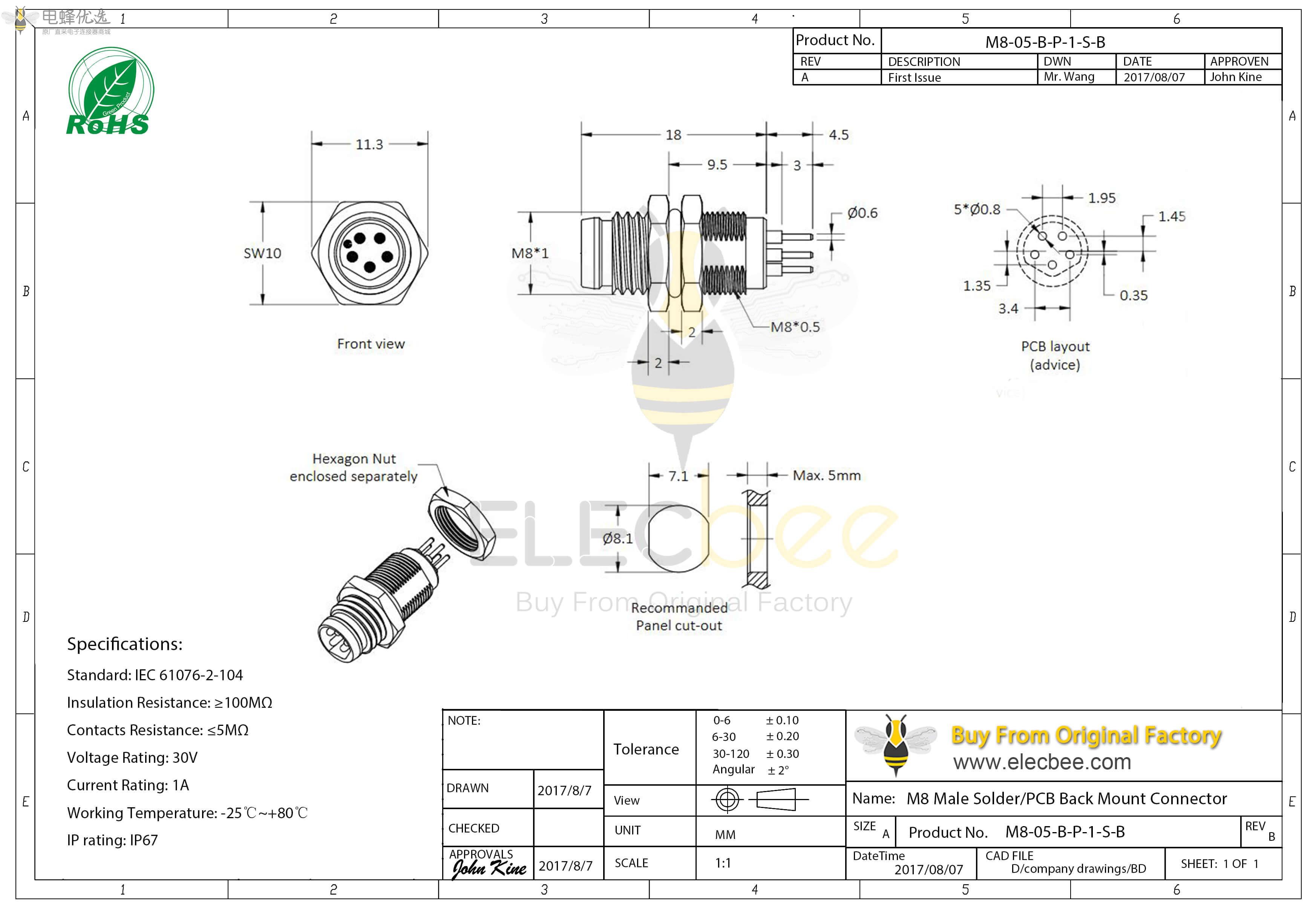 - M8, 5芯, B型, 公座, 后锁板, 直式, 防水, PCB ;