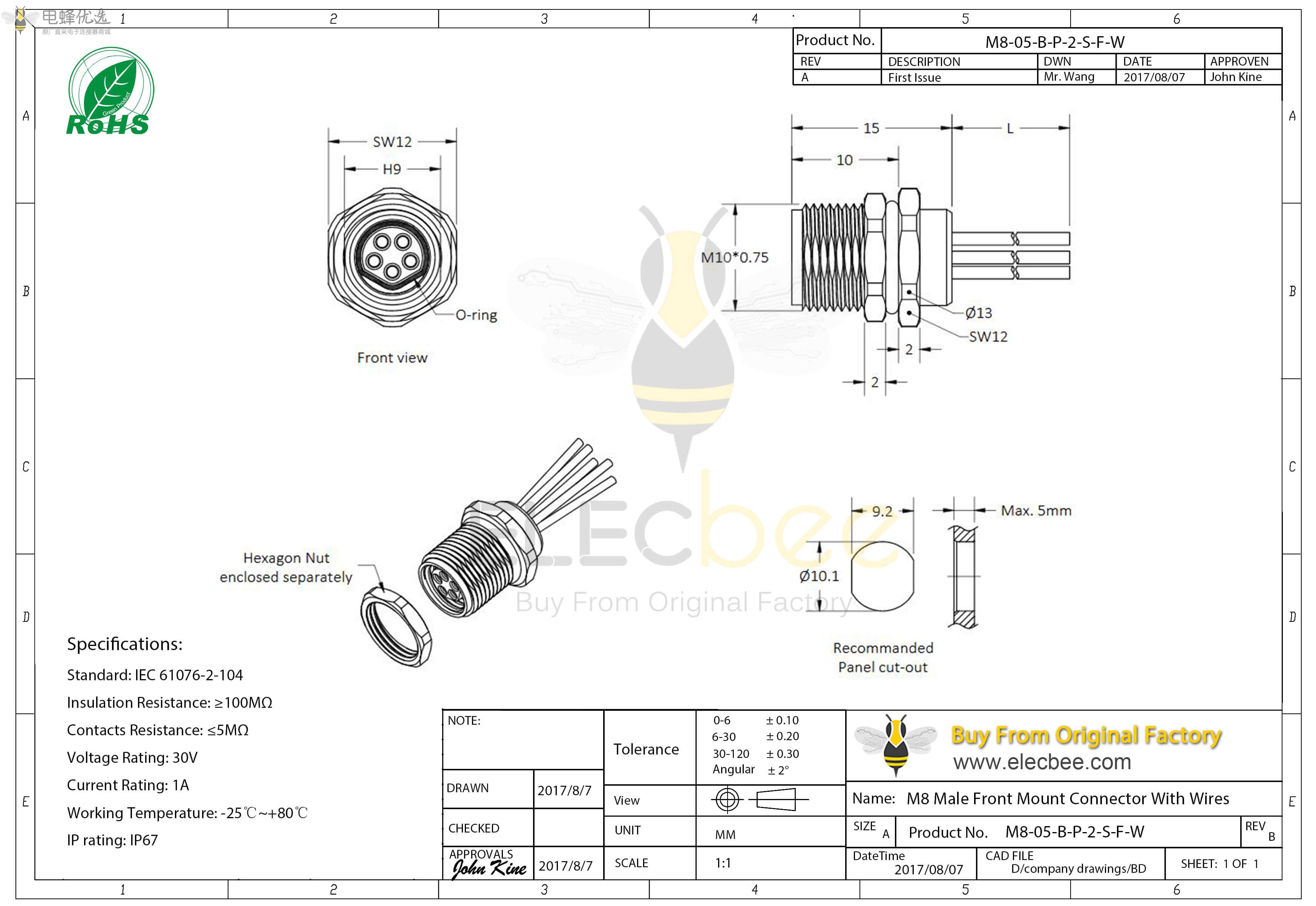 - M8, 5芯, B型, 公座, 前锁板, 直式, 防水, PCB,焊接 ;