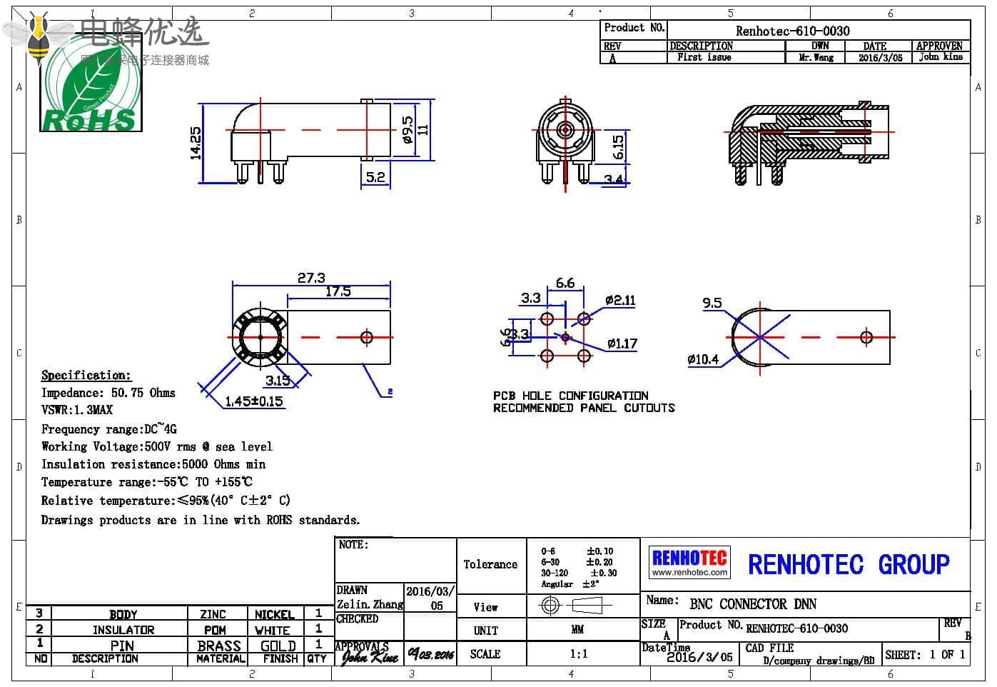 - PCB板端,母头,弯式,锌合金,RF射频同轴,BNC连接器,4脚,50欧姆,75欧姆;