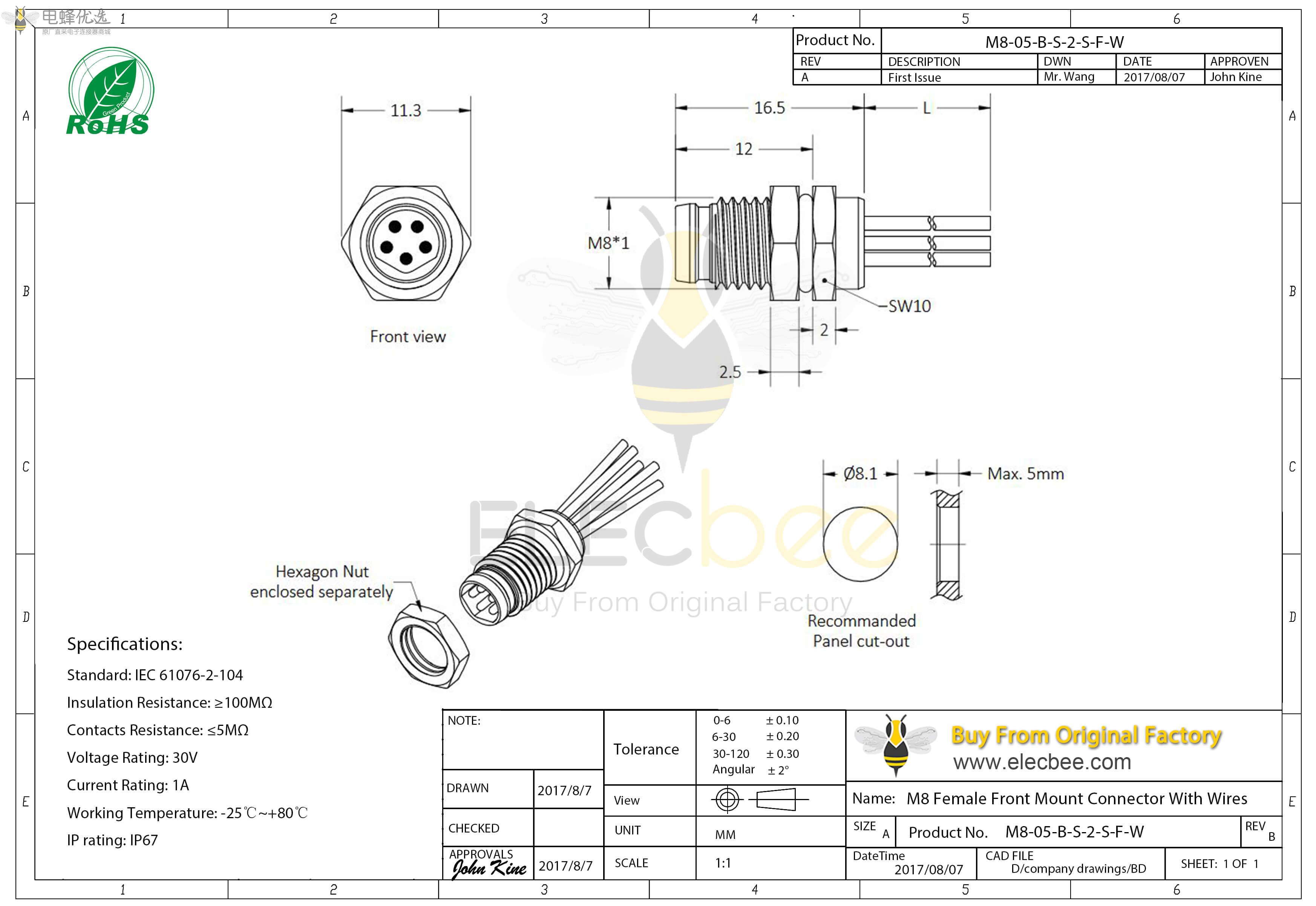 - M8, 5芯, B型, 母座, 前锁板, 直式, 防水, PCB,焊接 ;