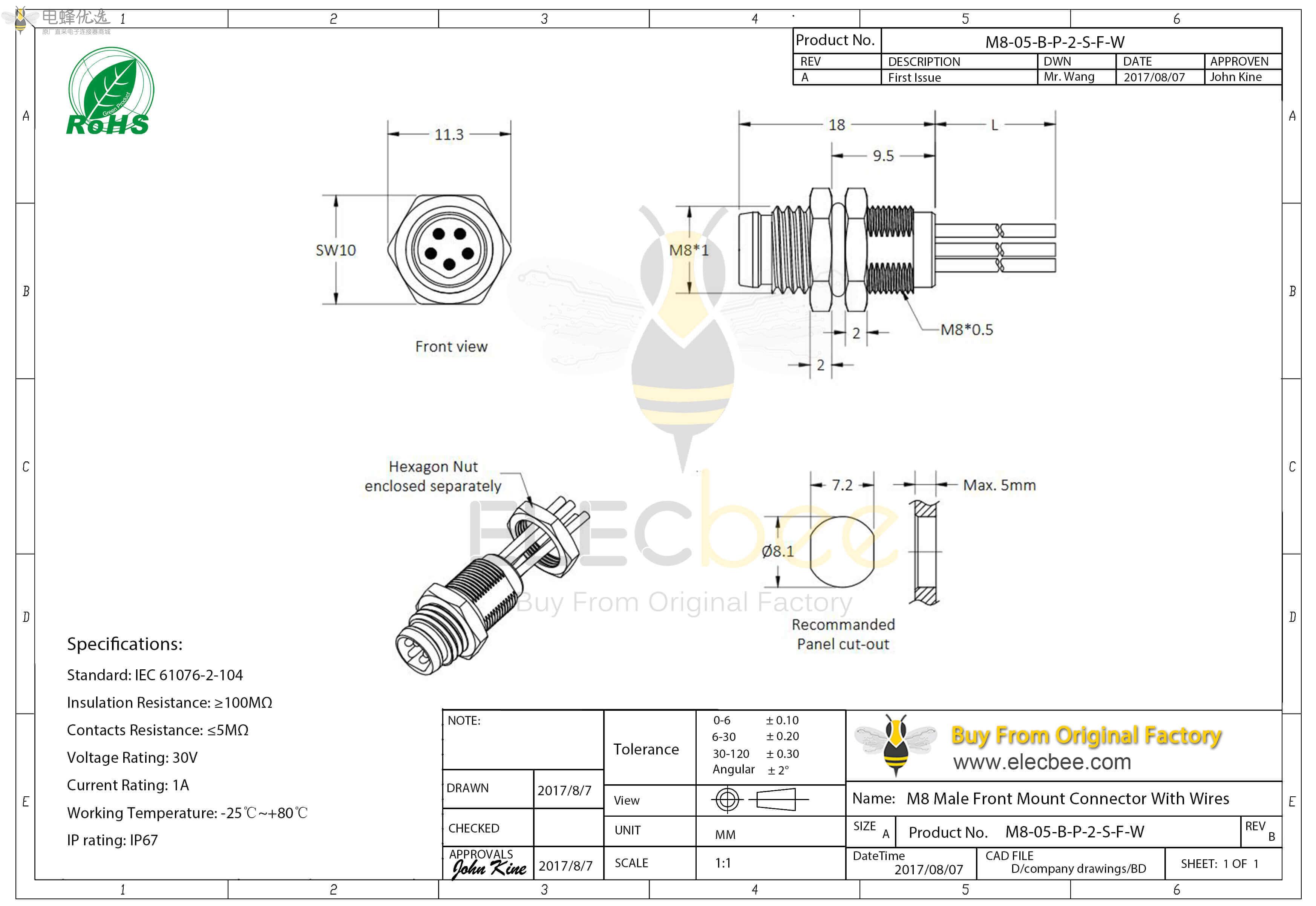 - M8, 5芯, B型, 母座, 后锁板, 直式, 防水, PCB,焊接 ;