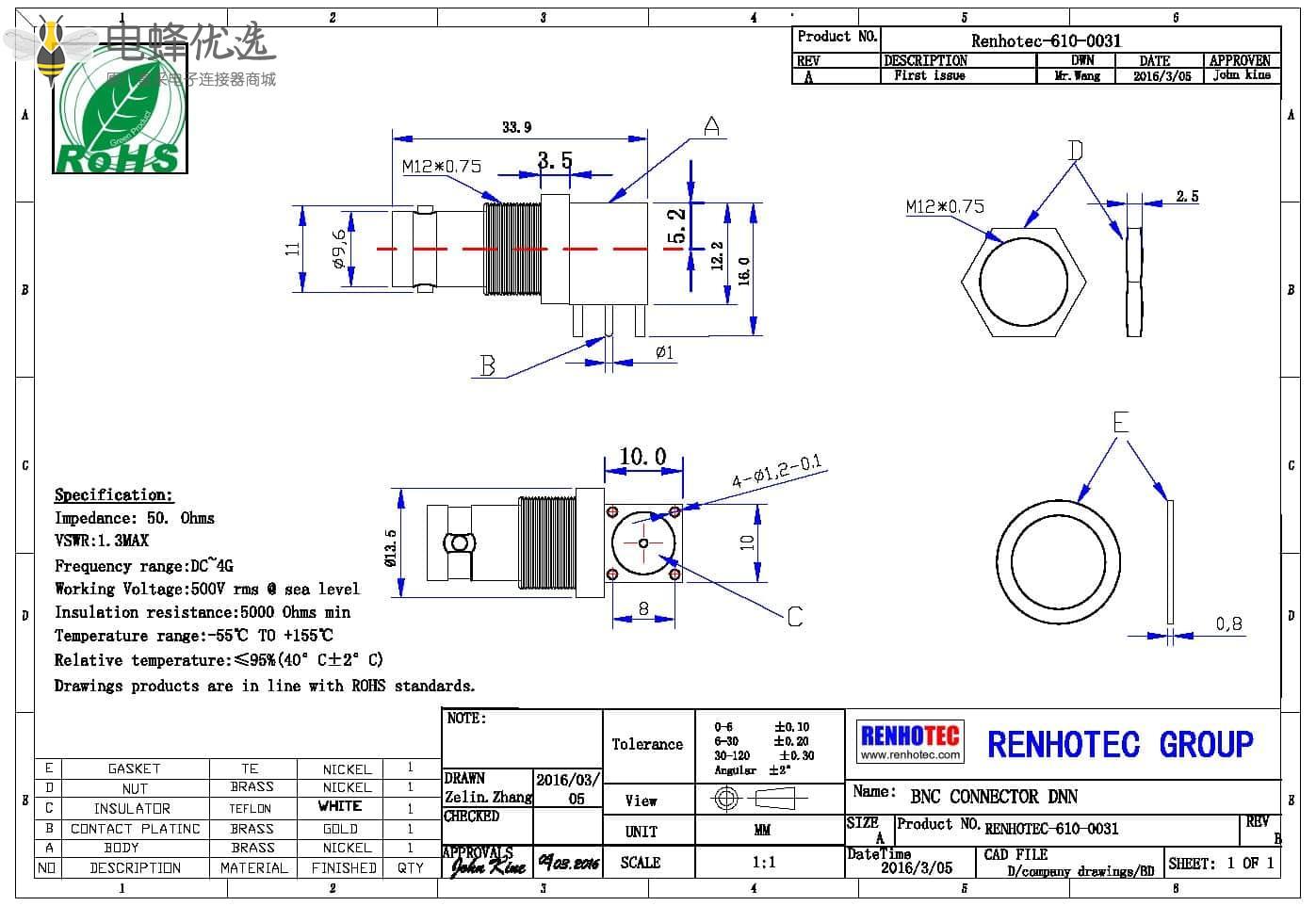 - PCB板端,母头,弯式,锌合金,RF射频同轴,BNC连接器,50欧姆,穿墙;