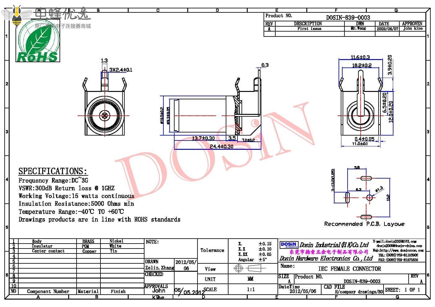 - 中心接触电阻: ≦ 10 mΩ (Milliohms max.)