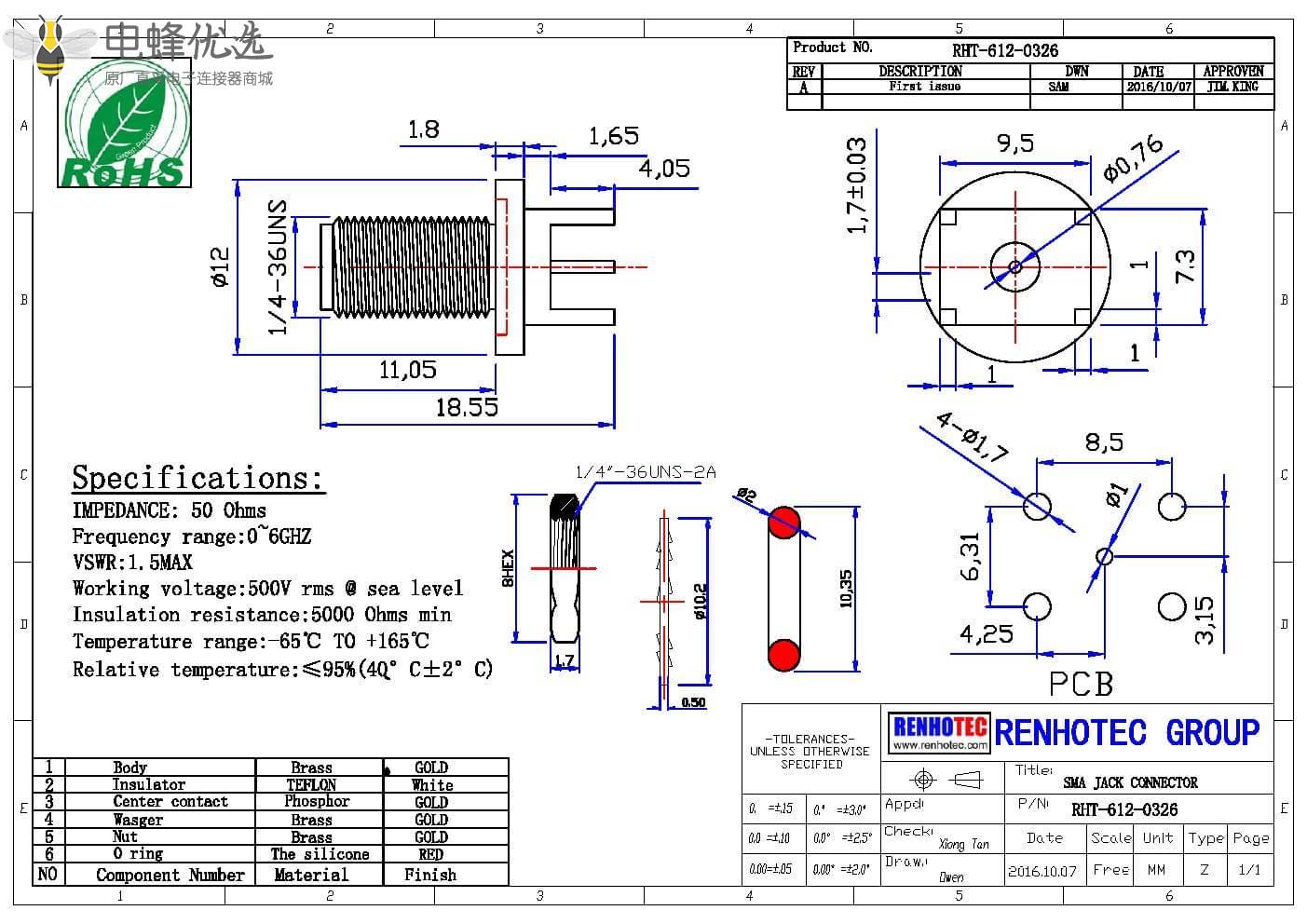 - SMA连接器,直式,母头,Pcb板,插孔,面板安装,50欧;