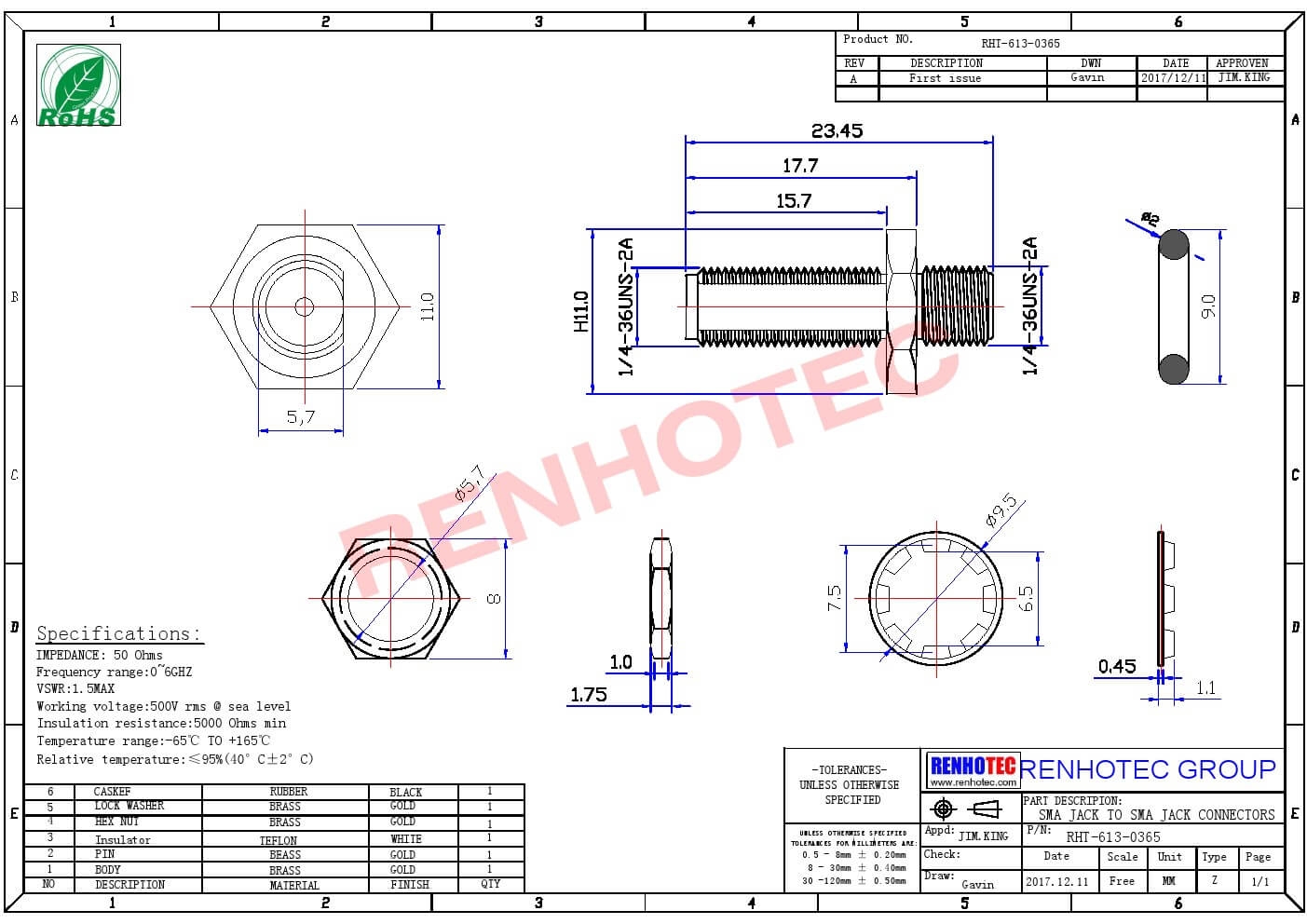 - 耐电压:接RG142,RG405线缆时为1000 V rms